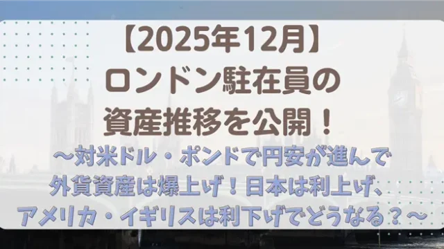 投資・資産運用 【2025年12月】ロンドン駐在員の資産推移を公開!~対米ドル・ポンドで円安が進んで外貨資産は爆上げ!日本は利上げ、アメリカ・イギリスは利下げでどうなる?〜 2025年12月21日 ぷーた どうも、ロンドン駐在員のぷーたです。 今回の記事は、次のような方の疑問を解決するために書いています。 ロンドンの駐在員は …