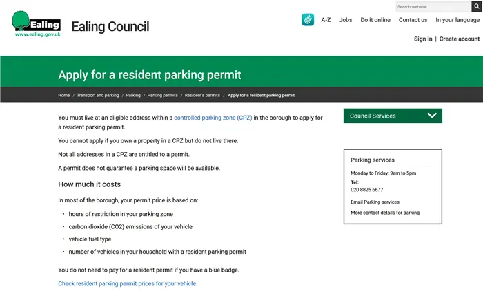 日本では役所の窓口で「何をどうすればいいか」をすぐに教えてもらえますが、イギリスでは電話もネットも回答がないことが普通です。例えば住居を決めてパーキングパーミットを取得する際にも、日本であれば役所に出向けば詳しくわかるまで説明してくれるのが通常ですが、イギリスでは下記のようなサイトを見て理解できれば申請できますが、理解できなければ時間をかけて問い合わせをしなければなりません。