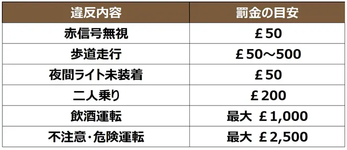 特に赤信号無視と歩道走行は警察の取り締まり対象になりやすく、ロンドン中心部では実際に切符を切られている人がいるようです。