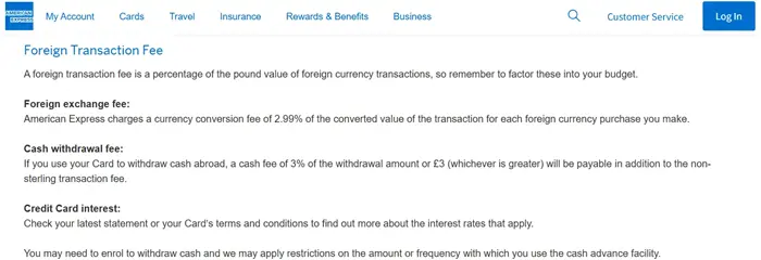 たとえばこちらはAmex UKのサイトですが、外貨取引の場合2.99%の手数料がかかる旨が記載されています。