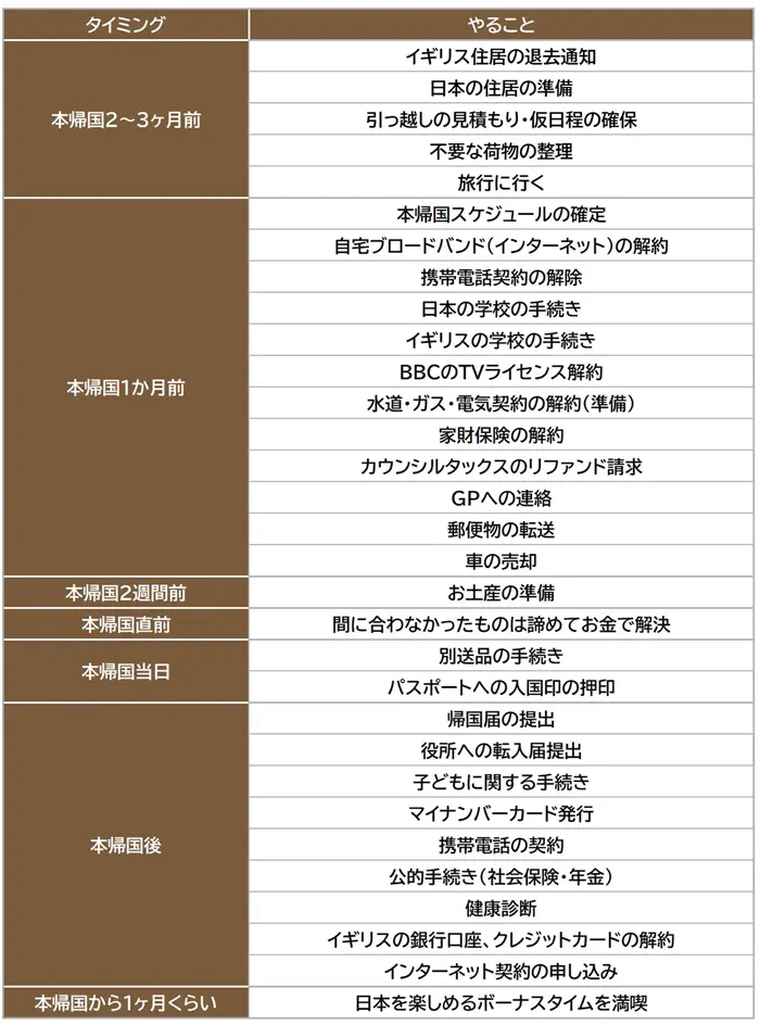 以上、イギリスから日本に本帰国するときに行うべきことを解説しました。ここでまとめとして、あらためて最初にお見せしたスケジュールをお見せしておきます。