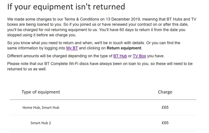 こちらはBTのブロードバンドのFAQページですが、BTでは60日以内にモデムを返却しない場合、65ポンドが請求されることを説明しています。私の知人の話では、引越しギリギリまでインターネットを使おうとして契約解除を帰国日近くに指定したところ、モデムの無料返却キットが届かず、仕方なく自分で郵便代を支払って返却したということでした。