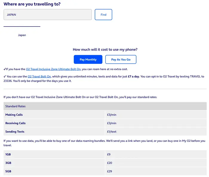例えばO2の場合、日本でO2のSIMカードで海外ローミングした場合1GBのデータ通信で9ポンド、通話は1分3ポンド、SMSは1回の送信で1ポンドと超高額です。