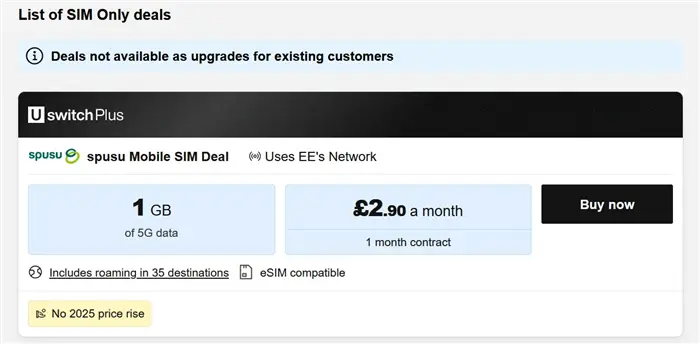 私がこちらの記事でご紹介しているイギリスの携帯電話契約を比較できるUswitchでは、最も安くイギリスの電話番号を維持する方法は、こちらのspusuとなっています。1ヶ月当たり2.9ポンド(約580円)が高いか安いかは考え方にもよると思いますが、イギリスの携帯電話番号がないためにサービスにログインができない、という事態を避けるためにはやむを得ないコストと考えるのもありかもしれません。