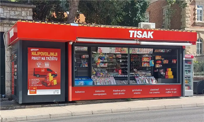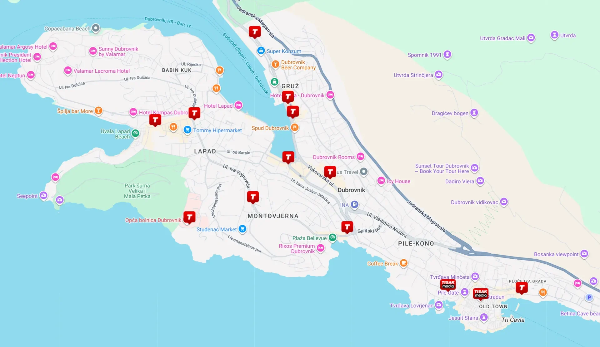 ドブロブニクでよく目にする赤い看板に白字のTISAKの文字の店がTISAKです。コンビニエンスストアよりは狭い店ですが、バスのチケットを販売しています。TISAKはクロアチア全土に広がっており、ドブロブニクには下記のTの文字の場所にあります。