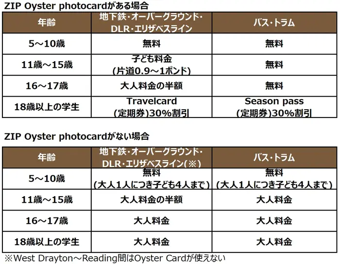 - ロンドンの電車やバスは子どもの年齢(5~10歳、11歳~15歳、16~17歳)によって料金が変わる。日本とは年齢のカテゴリーが異なるので注意