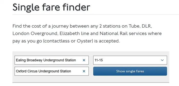 こちらのページでは、ロンドンの地下鉄、オーバーグラウンド、DLR、エリザベスラインなどでの片道料金を確認できます。11~15歳のイーリング・ブロードウェイ駅からオックスフォードサーカス駅間の料金を見てみましょう。