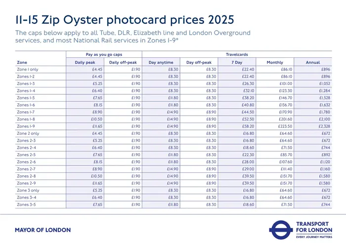 - 11-15 Zip Oyster photocardがない場合:3.5ポンド+紙の切符の購入の手間がかかる