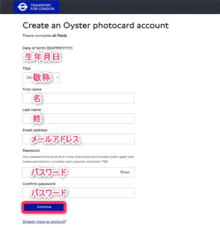 まずはTfLのCreate an Oyster photocard accountページにアクセスしてアカウントの作成をします。注意が必要なのは、アカウントを作成するのは親となる点です。親の氏名や生年月日などの情報を入力します。