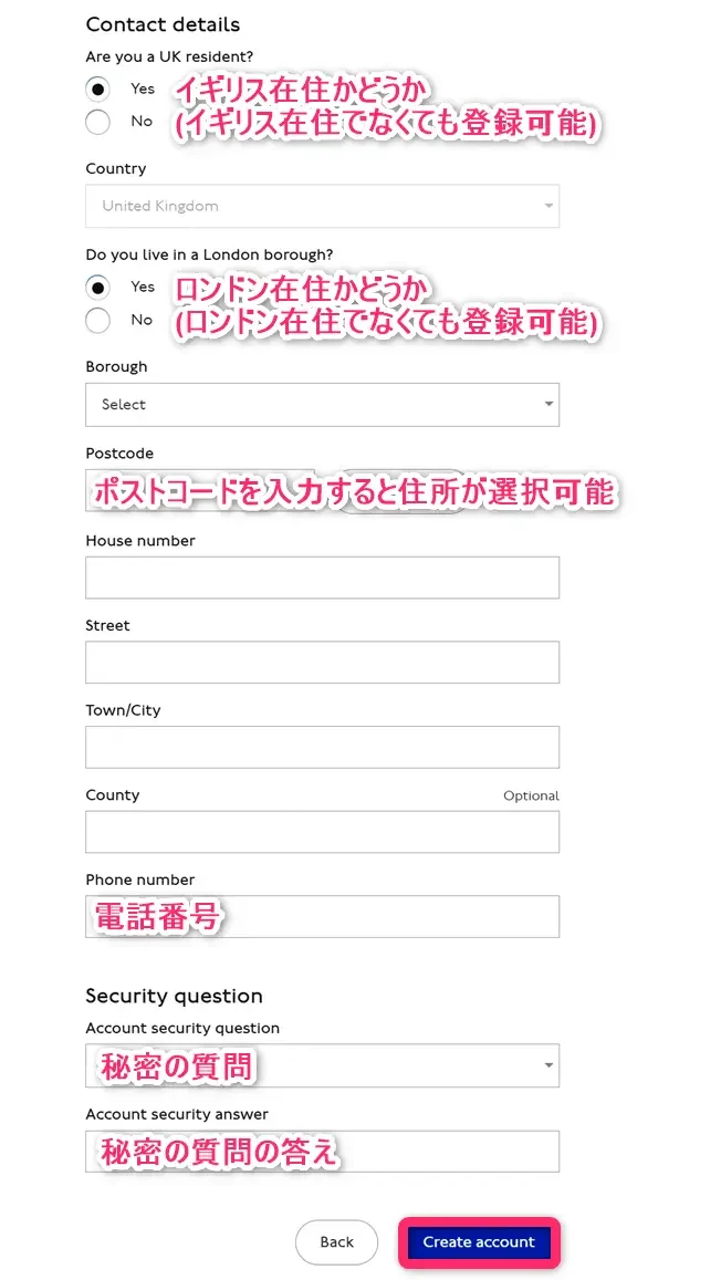 住所や電話番号を入力します。住所はイギリス在住であればポストコードを入力すれば自動で入力されます。