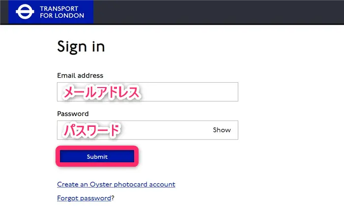 まずはOyster photocardアカウントでログインしてみましょう。こちらのWebサイトからメールアドレスとパスワードを入力して、submitを押します。