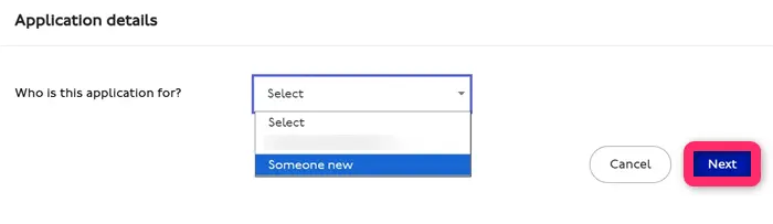 申請するのは子どものカードとなりますので、自分の名前ではなくSomeone newを選択してNextを押します。