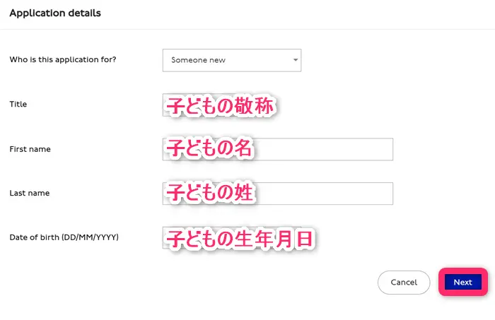 子どもの氏名、生年月日を入力してNextを押します。