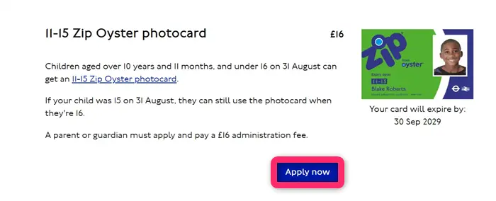 続いて11~15歳用の11-15 Zip Oyster photocardです。このカードは発行する価値が非常に大きいため、もしこの年齢のお子さんがいる場合には必ず発行しておきたいカードです。