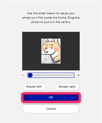アップロードする写真を選択すると、下記のような画像の範囲選択が可能になりますので、上記の写真の例を参考にして、子どもの顔が見えるように調整します。この写真がカード実物に使用させることになります。