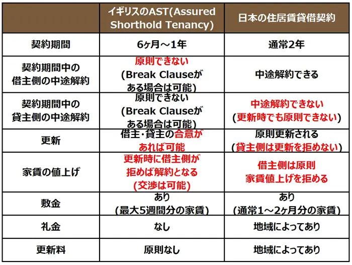 ここでイギリスのASTと日本の一般的な住居賃貸借契約を比較してみましょう。