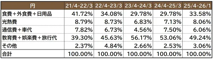 それぞれのパーセンテージを見てみます。教育費+娯楽費+旅行代が家計全体の50%近くになっていますが、食費+外食費+日用品が相対的に割合を伸ばしてしまっています。