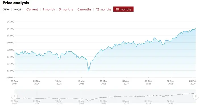 こちらはイギリスのロンドン株式市場に上場する株式の上位101~350位までの株式で構成されるインデックスファンドです。こちらの運用成績は下記のとおりです。2025年8月以降の動きとしては、上げ下げしながらも価格を上げてきており、2026年に入ってからも順調に伸び続けています。