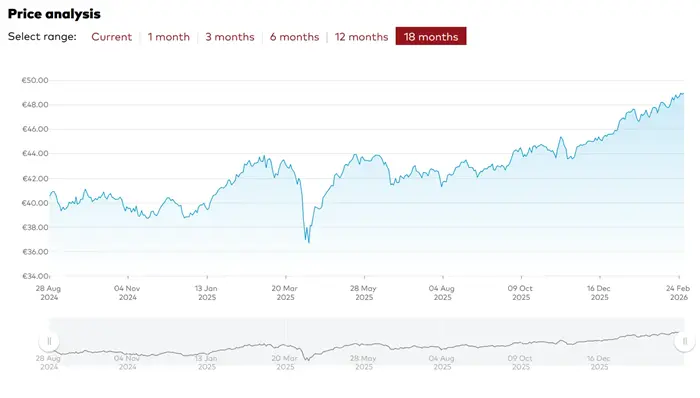こちらの投資信託は、イギリス以外のヨーロッパの先進欧州各国に投資するインデックスファンドとなっています。過去18ヶ月間の運用成績は下記のとおりです。2025年4月のトランプショックでの落ち込みがありましたが、それ以外の期間は緩やかに成長しています。