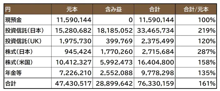 - 元本は109万円増加、含み益は341万円の増加となり、合計7,633万円で資産最高額を継続して達成
