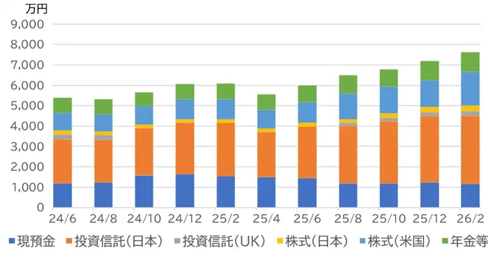 2024年6月~2026年2月の推移を横並びで確認してみます。2024年6月には5,400万円程度だったものが、この1年8ヶ月で2,200万円くらい増加しました。