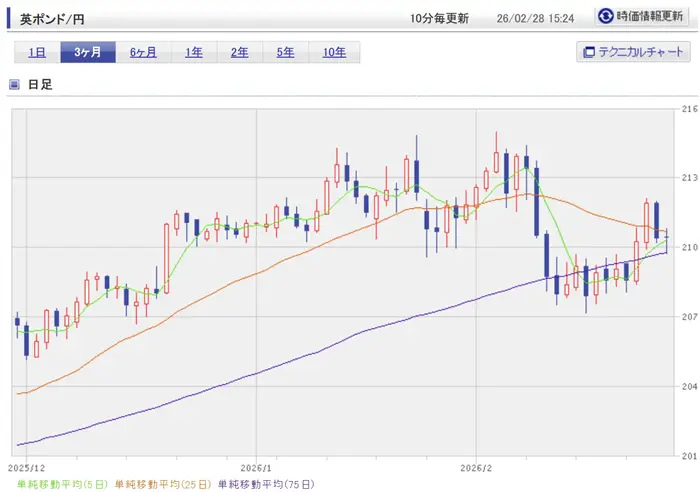 ですがポンド安は長くは続かずポンド高傾向で推移し続け、10月に入り自民党総裁選で高市早苗氏が総裁に選出されると積極財政政策への懸念からかポンド高が加速し一時205.33円まで上がりました。さらにイギリスのスターマー政権が11月26日に発表した秋季予算案が財政健全化に配慮した点からポンド高傾向が継続し、全体的な円安基調を受けたこともあり2月4日には1ポンド=214.97円の値を付けましたが、記事執筆の2月28日時点では1ポンド=210円となっています。