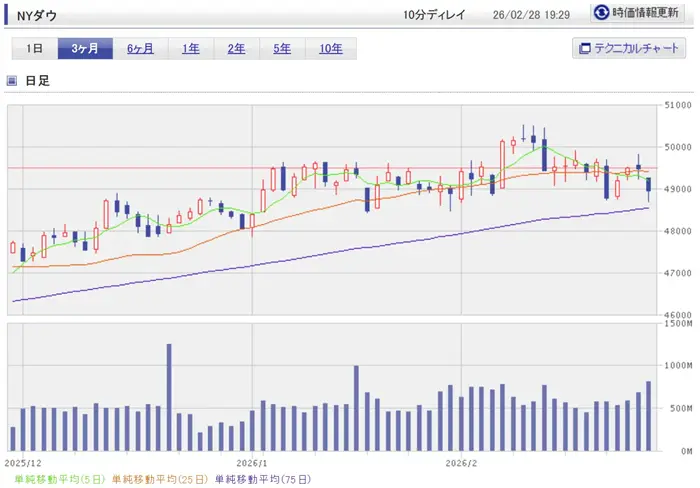 2025年12月から2026年2月の間でアメリカのNYダウ平均株価の値動きを見てみましょう。12月以降順調に伸びを見せたNYダウ平均株価は2026年2月10日に50,512.79ドルの過去最高値をつけています。2月中旬以降は50,000ドルを割り込みましたが、依然として高い水準であることに変わりはありません。
