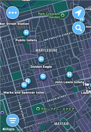 また、イギリスのトイレ用アプリを使用するのも1つの手です。こちらのToilets4Londonアプリでは、ロンドンのトイレ情報が地図上で確認できるアプリです。上の例のGoogle Mapと同様にオックスフォードサーカスの情報を見てみると、トイレ情報が表示されます。こちらのアプリではJohn LewisやMarks and Spencerのようなお店のトイレが表示されているので、利用できる可能性が高まります。