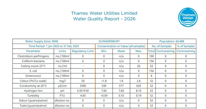 この水質に関する管理や情報公開は各水道会社からおこなわれています。たとえば私の住むイーリングでは、Thames Waterが水道を供給していますが、Webサイトでポストコードを入力すると、地域の水質レポートを見ることができます。