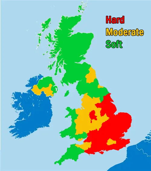 イギリスの水は硬水が多く、ミネラル(カルシウムやマグネシウム)が豊富に含まれています。こちらはFountain FiltersというWebサイトの水が硬水・軟水かを確認できるマップです。実際にはすべてが硬水というわけではないのですが、人口の多い地域は硬水が多いと言えそうです。特にロンドンは硬水の地域がほとんどです。
